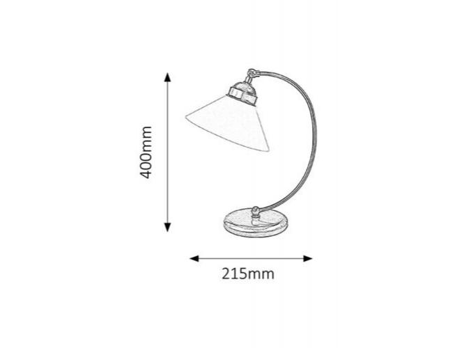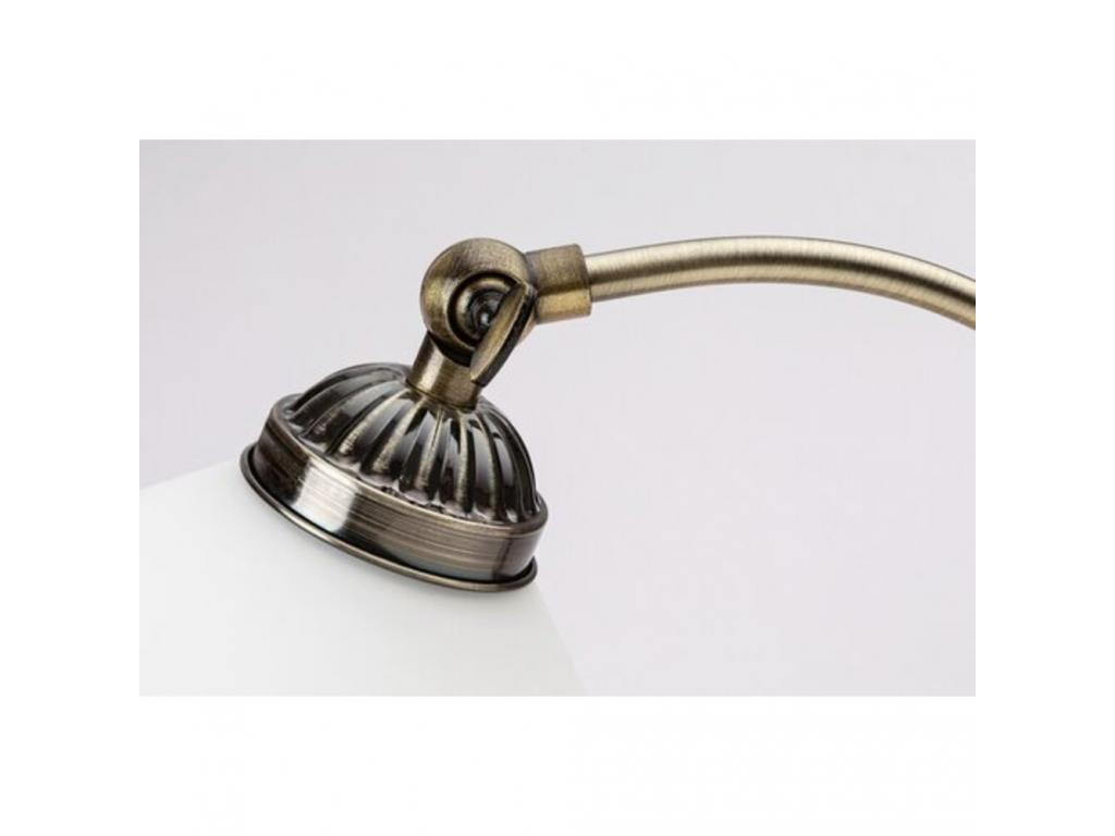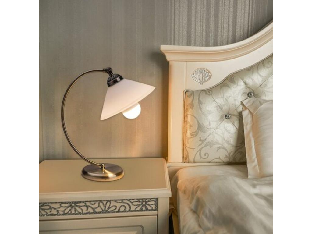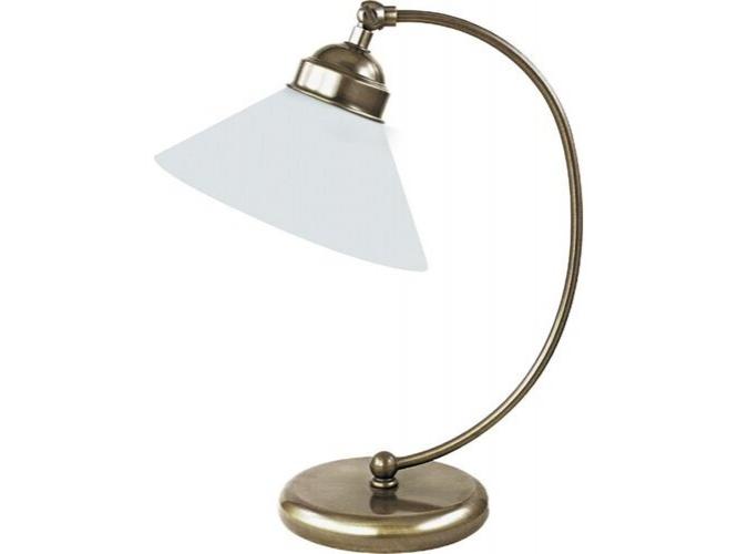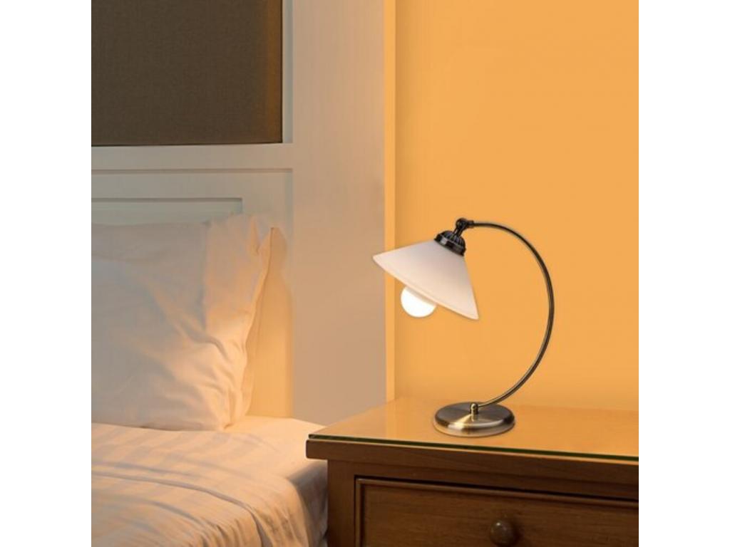 Klasszikus megjelenésű éjjeli lámpa 1 db foglalattal. 21,5 cm széles, 39 cm magas, bronz színű fém test és fehér színű üveg lámpabúra. A lámpatest E27-es foglalatkialakítású, max. 60W teljesítményű energiatakarékos fényforrással is használható.