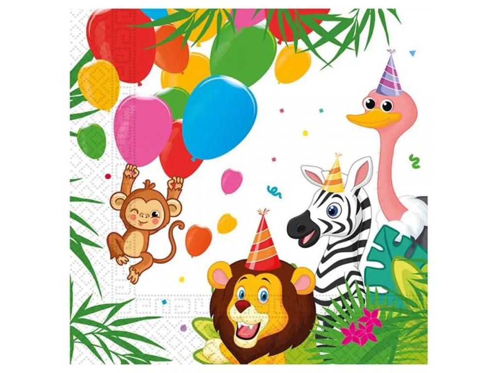 Varázsolj igazi dzsungelhangulatot a gyerekzsúrra ezekkel a színes és vidám papírszalvétákkal! Az aranyos majom, az oroszlán, a zebra és a strucc mind bulisapkában várják, hogy a kis vendégek is csatlakozzanak az erdei mókához. A rengeteg színes lufi és a zöld növények között igazán vidám, játékos hangulat uralkodik tökéletes választás egy születésnapi dzsungelpartihoz.