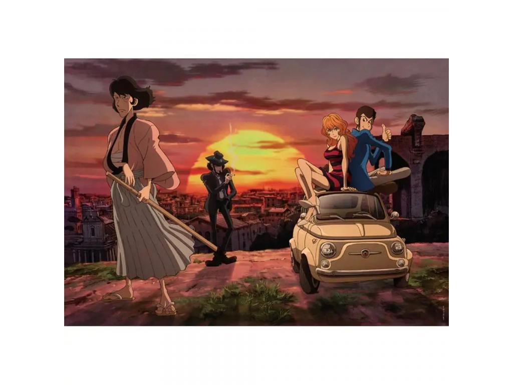 A 70 x 50 cm-es puzzle képe egy stílusos és laza jelenetet örökít meg: Lupin és Fujiko egy klasszikus Fiat 500-as tetején ülve, a háttérben Jigen és Goemon, miközben a város fényei és a lenyugvó nap drámai fénybe borítják a látképet. A színek melegek, a kompozíció filmszerű, és minden darabka egy-egy kis mozaikja ennek az olaszos hangulatú bűnügyi történetnek.