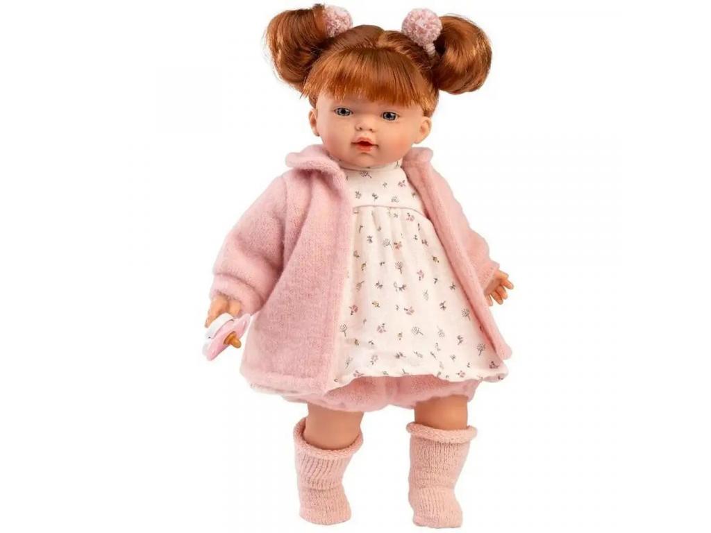 Llorens: Lea 33cm-es vörös hajú síró baba cumival rózsaszín kabátban