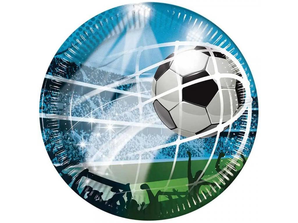 Ha a gyerkőcöd odavan a focizásért, vagy egy igazán sportos szülinapot tervezel, akkor ez a focis papírtányér szett telitalálat lesz! A tányérok dizájnján egy klasszikus fekete-fehér futball labda épp a hálóba csapódik, a háttérben pedig egy stadion kivilágított lelátói és a szurkoló tömeg fokozza a hangulatot szinte hallani lehet a gólörömöt!