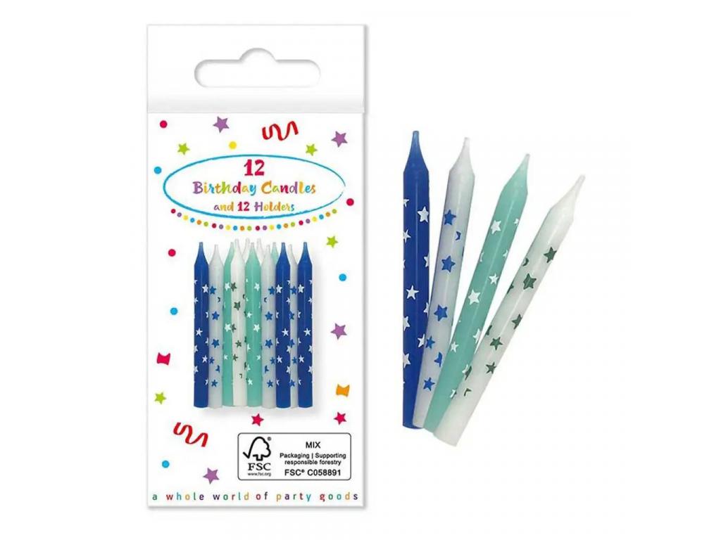 Egy születésnapi torta sem lehet teljes gyertyák nélkül és ha már gyertyák, legyenek igazán különlegesek! Ez a kék szülinapi gyertya szett 12 darab csillagmintás gyertyát tartalmaz, melyek a sötétkék, világoskék, zöldes és fehér árnyalatokkal friss, fiús vagy semleges hangulatot varázsolnak a tortára. A fehér csillagokkal díszített gyertyák igazán játékosak és ünnepiek, így tökéletesen illenek kalózos, űrös, autós, vagy akár tengeri tematikájú bulikhoz is.