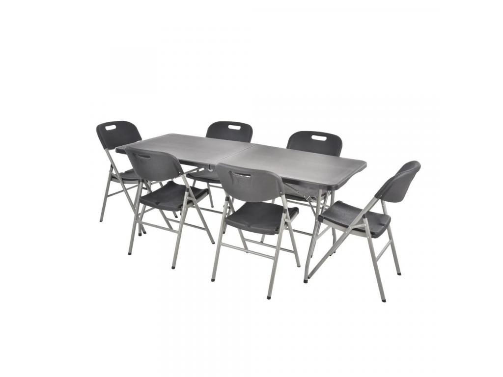 Alkalmas kertekbe és belső terekbe. Alkalmas nedves környezetben való használatra. Összecsukható készlet hat székből és egy asztalból, acél-alumínium profilokból, komaxit felületkezeléssel. Az asztal és a székek felülete rendkívül tartós műanyagból készült