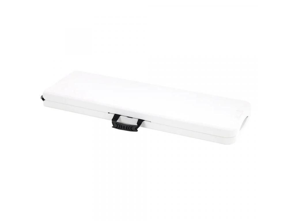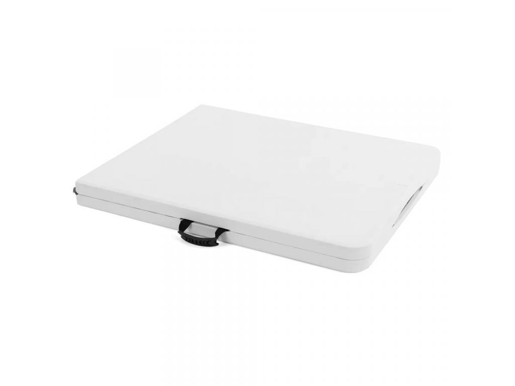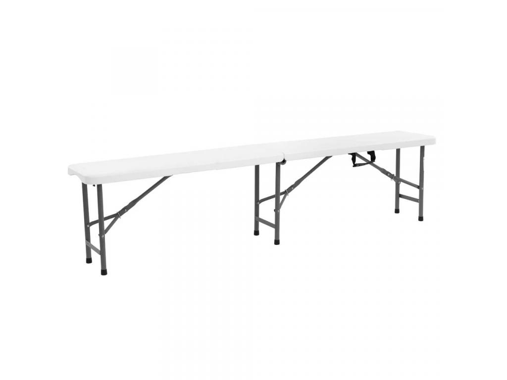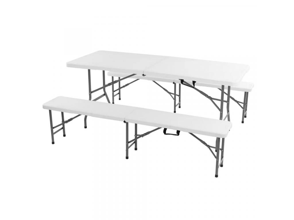 Két padból és egy asztalból álló összecsukható készlet acél-alumínium profilokból és komaxit kivitelben. Az asztal és a székek felülete rendkívül tartós műanyagból készült.