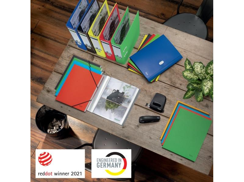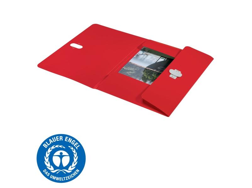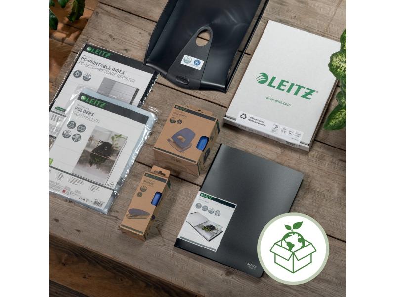 Prémium minőségű, 3-pólyás mappa A4-es dokumentumokhoz. Kllímasemleges, 100%-ban újrahasznosítható és Blue Angel tanúsítvánnyal rendelkező újrahasznosított műanyag alapanyag.