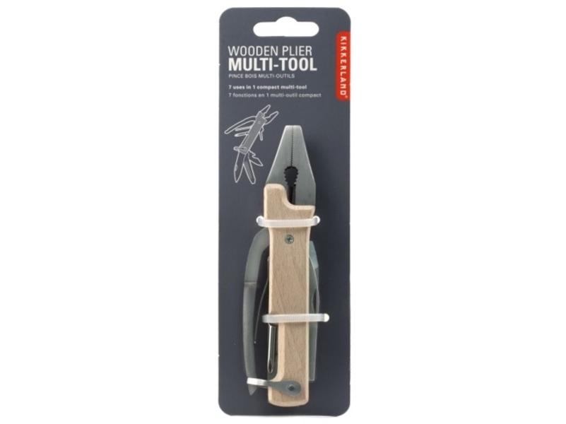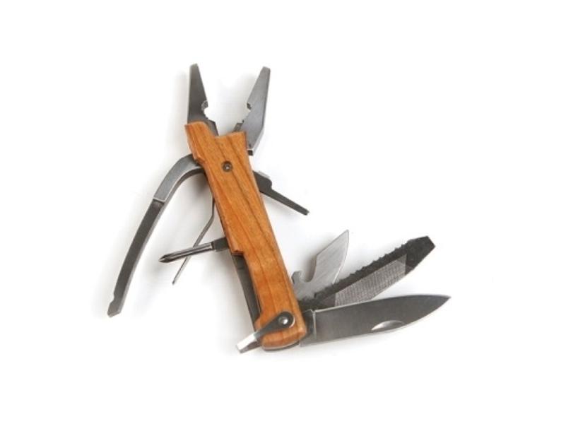 A Kikkerland fa nyelű multifunkciós zsebszerszám leírása: Ez a multifunkciós szerszámkészlet a következő szerszámokból áll: fogó, laposfejű csavarhúzó, üvegnyitó, reszelő, fűrész, kés és csillagfejű csavarhúzó.