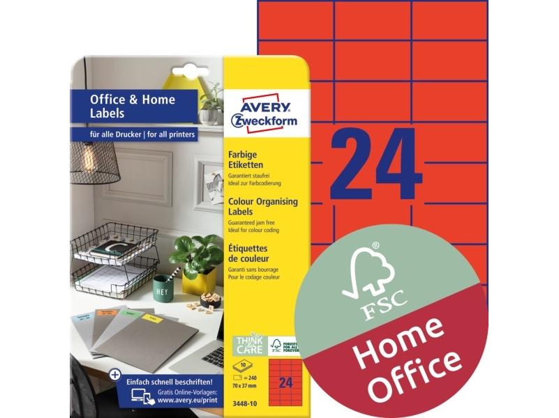 Az Avery 3448-10 70x37mm 240db-os piros univerzális etikett leírása: Az Avery Zweckform 3448-10 cikkszámú, piros színű címkéi 70x37 mm méretben tökéletesek például információk, figyelmeztetések feltüntetésére vagy termékek felcímkézésére.
