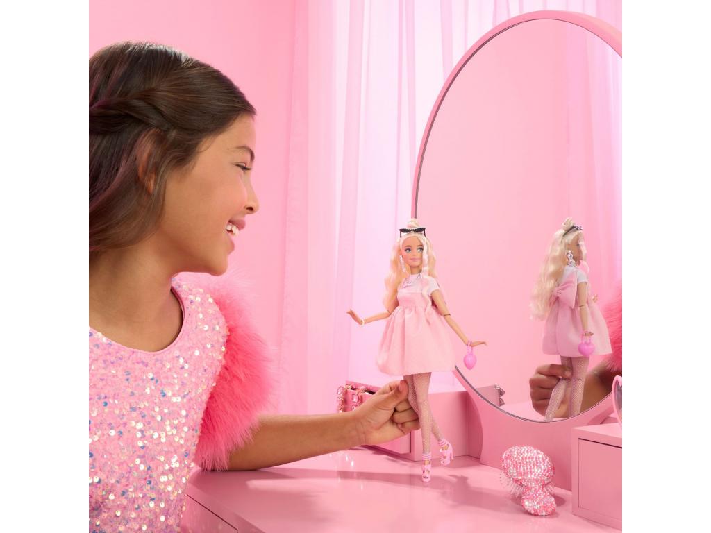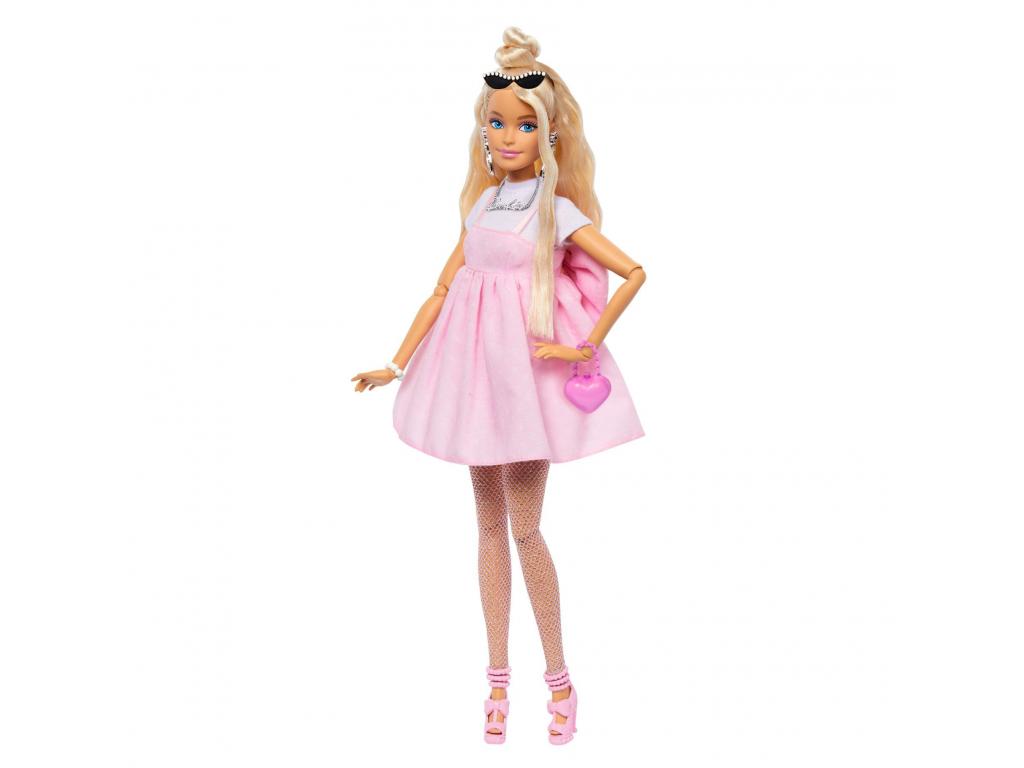 Barbie most is elhozza neked a divatvilág legújabb trendjeit ezzel a gyönyörű, szőke babával, aki stílusával és kiegészítőivel garantáltan lenyűgöz mindenkit! Ez a különleges baba egy elegáns, halvány rózsaszín ruhát visel, amelyet egyedi részletek, például hálós harisnya és platform magassarkú tesznek igazán különlegessé. A kiegészítők között megtalálható egy szív alakú kézitáska, gyöngyökkel díszített napszemüveg, karkötő és nyaklánc is, amelyek Barbie egyedi megjelenését emelik ki.