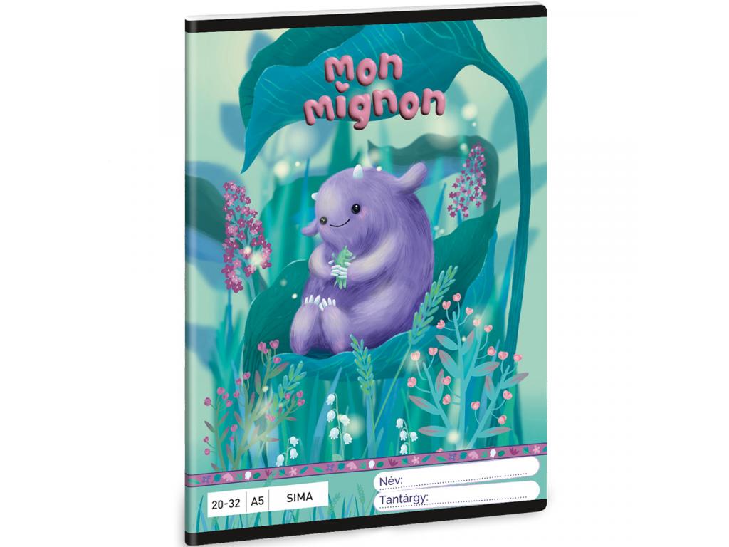 A Mon Mignon sima füzet A/5 20-32 igazi varázslatos hangulatot csempész gyermeked iskolai napjaiba. A borítón egy aranyos, lila színű, kedves szörnyecske üldögél egy mesebeli erdő közepén, körülötte színes virágokkal és levelekkel. Ez a bájos grafika nemcsak vidámságot sugároz, hanem ösztönzi is a gyerekek kreativitását, miközben jegyzetelnek, rajzolnak vagy álmodoznak a füzet lapjain.