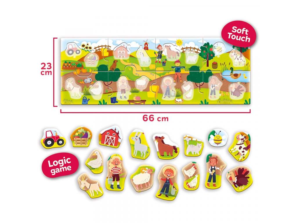 A szett különlegessége, hogy a darabok nemcsak kirakóként működnek, hanem különálló figuraként is használhatók a szerepjátékhoz, így a gyerekek akár új történeteket is kitalálhatnak a gazdaság életéről. A "soft touch" felület kellemes tapintású, biztonságos, és ellenáll a mindennapi használatnak így ideális választás a bölcsődés és óvodás korosztálynak.