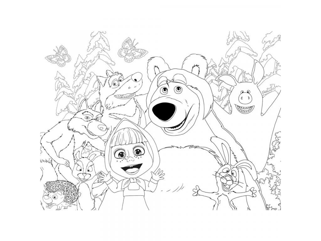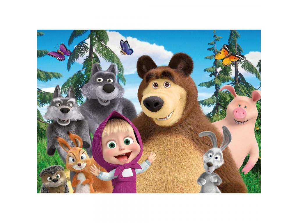 A puzzle színes oldalán egy vidám jelenet látható: Mása örömmel szalad a medve és az erdei állatok nyúl, farkas, sün és még pillangók társaságában, mindezt gyönyörű fenyőerdő és kék égbolt öleli körbe. Ez a jelenet nemcsak derűs és barátságos, hanem arra is inspirálja a gyerekeket, hogy felfedezzék az állatok és a természet világát.