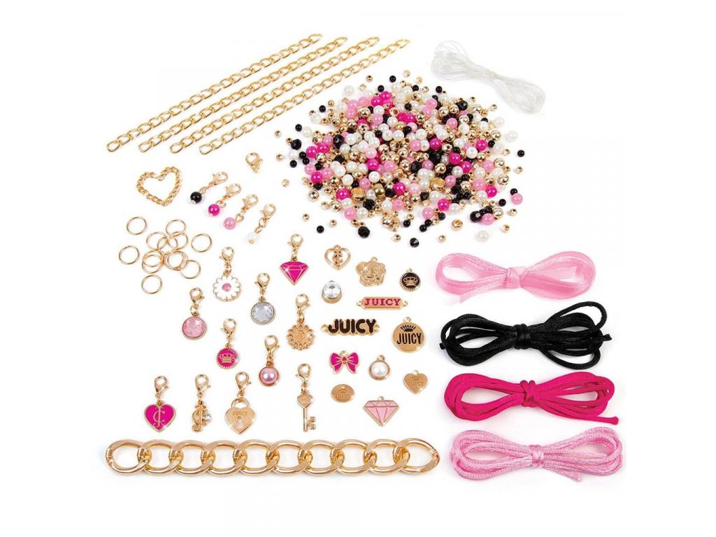 A táska 494 darabos tartalmában csodaszép gyöngyök, színes zsinórok, aranyszínű láncok, gyönyörű charmok és Juicy feliratok találhatók, amelyekkel minden egyes karkötő egyedi és stílusos lesz. A készlet nemcsak kreatív időtöltés, de fejleszti a finommotorikát, az önkifejezést és a stílusérzéket is. A kis ékszerkészítő táska pedig nemcsak praktikus, de csillogó megjelenésével minden kislány kedvence lesz.