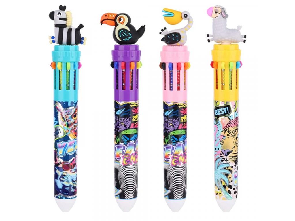 Ez a Safari kaland 10 színű golyóstoll igazi vidám színfoltja lesz az iskolai felszerelésnek, és garantáltan elnyeri a gyerekek tetszését! Minden toll tetején egy cuki állatfigura található például zebra, tukán, pelikán vagy bárány , amelyek játékos hangulatot visznek a tanulásba. A toll testét élénk, dzsungel mintás grafikák díszítik, így már a ránézés is inspiráló lehet.