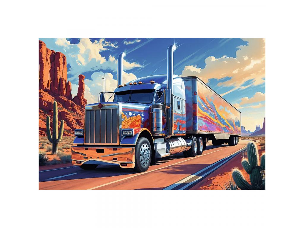 Ha gyermeked rajong az erős gépekért és az izgalmas utakért, akkor a Teherautó az úton puzzle lesz az új kedvence! Ez a 160 darabos kirakó egy lenyűgöző festett kamiont ábrázol, amely egy sivatagos, vadnyugati tájon halad át a napsütéses égbolt alatt. A hatalmas, krómfényben csillogó amerikai kamion látványa már önmagában is lenyűgöző, de a színes motívumokkal díszített oldalfal és a táj összhatása különösen hangulatossá teszi a kirakott képet.