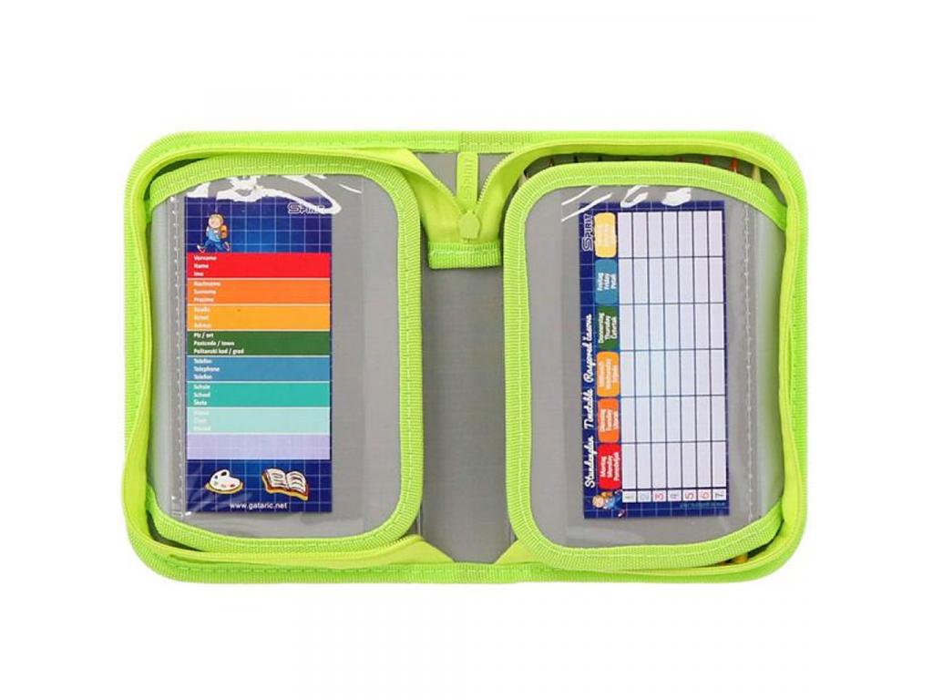 Tartalmaz: ceruzák, színesek, filcek, radír, hegyező, vonalzó, háromszög, névcímke, órarend