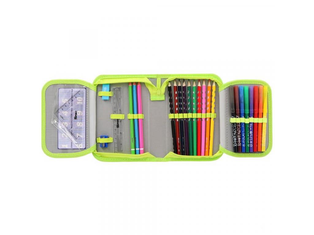 Ez a kihajtható, 1 cipzárral záródó tolltartó nemcsak stílusos, hanem rendkívül praktikus is: a belsejében 28 darabos, teljesen felszerelt írószercsomag várja a kisdiákot. Találsz benne 3 grafitceruzát, 10 színes ceruzát, 8 filctollat, radírt, hegyezőt, vonalzót, háromszöget, névcímkét és egy órarendet is. A gumipántok gondoskodnak róla, hogy minden eszköz rendezetten és biztonságosan a helyén maradjon.