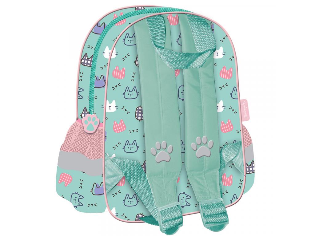 A My Little Friend Fluffy Kitty cicás ovis hátizsák 28x25 cm tökéletes választás minden kis ovis számára, aki imádja az aranyos cicákat és a vidám színeket. A hátizsák elbűvölő mintáját egy nagy, cuki kiscica fotója díszíti az elülső zseb közepén, míg az egész táskán vidám, macskás grafika és szívecskék teszik még játékosabbá a megjelenést. A rózsaszín és mentazöld alapszínek, valamint a mancs formájú cipzárhúzók igazán különleges és barátságos külsőt kölcsönöznek a táskának, amit minden gyerek örömmel visel.