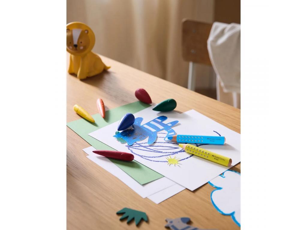 A legkisebbek első zsírkréta készlete, amit imádni fognak! A Faber-Castell csepp alakú zsírkréta szettje 2 éves kortól ajánlott, és kifejezetten kisgyermekek kezéhez lett tervezve. A kréták különleges formája nemcsak játékos megjelenésű, de segít a helyes ceruzafogás elsajátításában is így már a legelső firkálások is fejlesztik a finommotorikát. A lekerekített, ergonomikus kialakítás révén a kréták könnyen megmarkolhatók, így a kis kezek magabiztosan alkothatnak színes rajzokat.