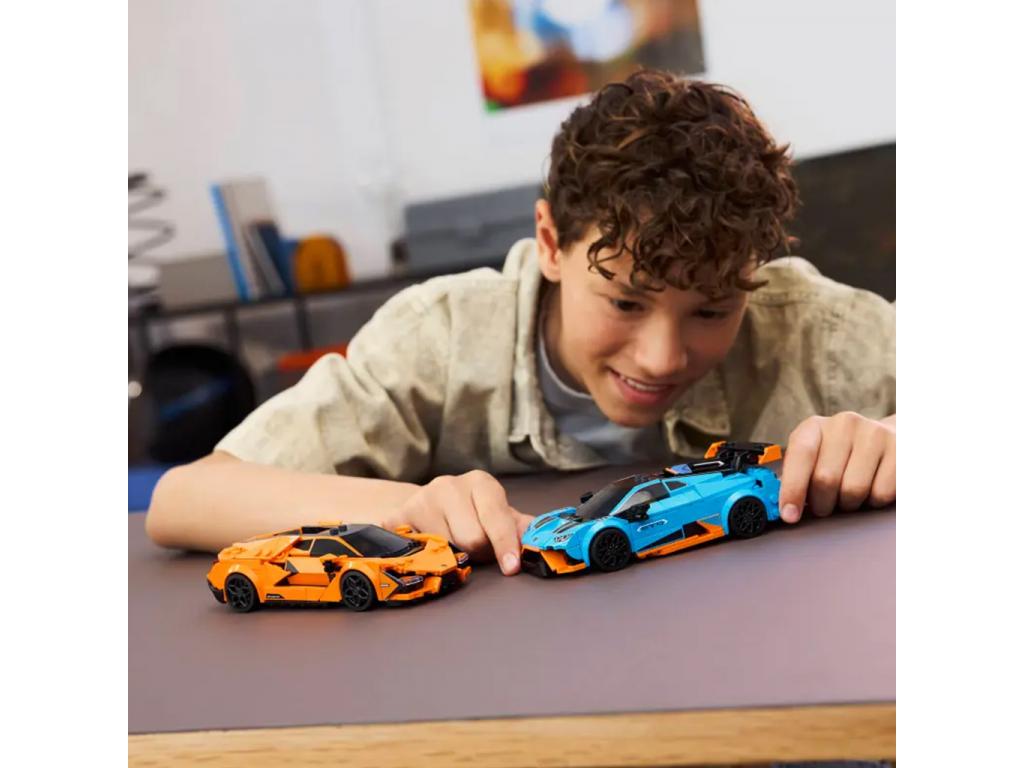 A V12-es motorral felszerelt Revuelto az olasz autógyártás legerősebb modellje, míg a Huracán STO az utakon és a versenypályán is megállja a helyét. Mindkét játék autón az igazi Lamborghini autók valósághű részleteit találod, ilyen például a légbeömlő, a légterelő és a futurisztikus, Y-alakú első és hátsó fényszóró. Mindegyik játékautóhoz tartozik egy pilóta minifigura, akit a gyerekek a volán mögé helyezhetnek, hogy versenyezhessenek.