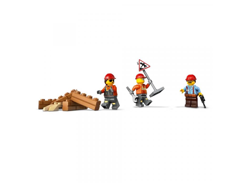 Építőipari LEGO játékkészlet vidám kiegészítőkkel Ehhez a szetthez LEGO minifigura-kiegészítők is tartoznak, például egy építési területet jelző tábla, egy csavarkulcs és egy rádió adó-vevő