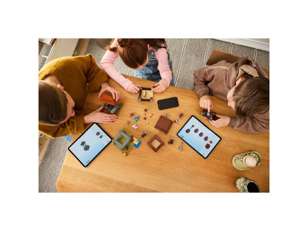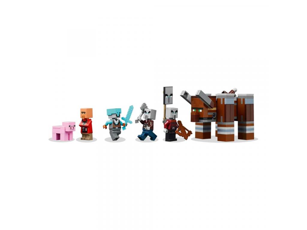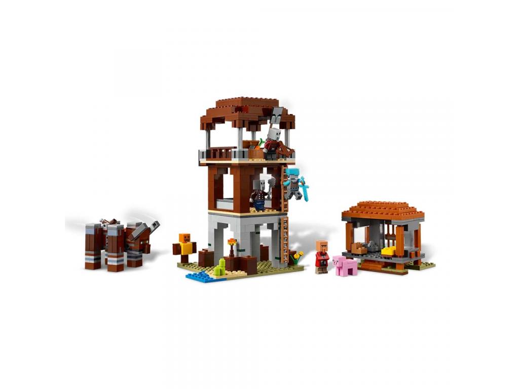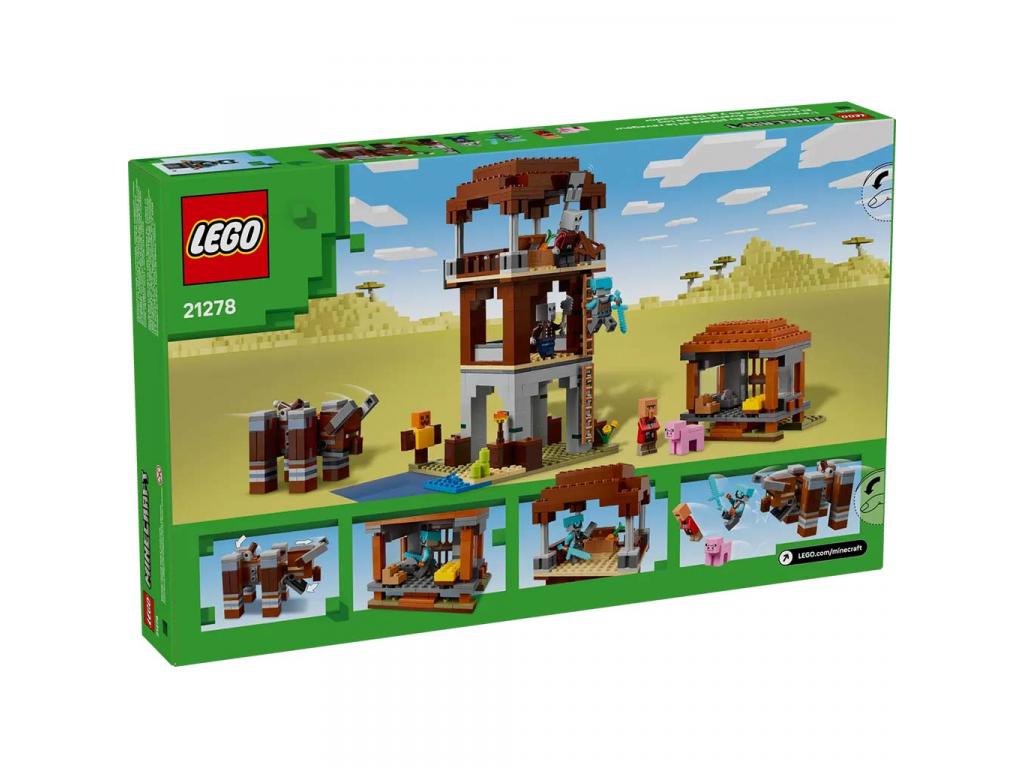 A szett 4 LEGO Minecraft minifigurát tartalmaz: Űrbéli Őrszem, Raid Captain, kőműves falusi és Bosszúálló. A gyerekek egy karral működtethető funkció segítségével a megépíthető Rombolófigura állkapcsát csattogtathatják és fejét mozgathatják. Az őrtoronyban létrák segítségével érheted el az emeleteket, és találsz még benne zászlókat, amelyeken fosztogatók arcképei jelennek meg, és egy értékes zsákmányt rejtő kincsesláda is vár rád. A kőműves házának kinyitható az ajtaja, bútorozott belsejében pedig egy ágyat és egy kővágót találsz. A készlet része még egy LEGO Minecraft malacfigura és olyan kiegészítők, mint a gyakorlóbábu, a fáklya, a répa, a vasrúd, a gyémántsisak, a gyémántkard, a nyílpuska és a vasfejsze. A LEGO Builder app extra szórakozást nyújt, hiszen a gyerekek a digitális eszközeiken felnagyíthatják és 3D-ben elfogathatják a modelleket. A szett 665 elemből áll.