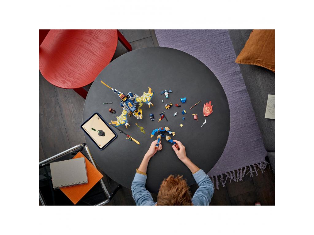 A gyerekek a Kai viharjáró robotja (71830) és a Kai EVO robotversenyzője (71783) készletekben (külön kaphatók) található robotokat a szett sárkányfigurájának hátára ültethetik. Ezt a készletet megépítheted a LEGO Builder app segítségével, amely egy izgalmas építési kalandon kísér végig téged és a gyermekedet. A készlet 584 elemből áll.