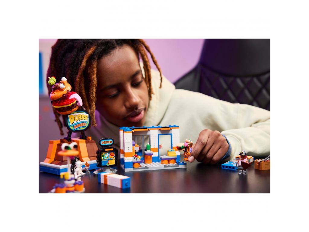 A gamerek nagyon élvezik majd a Durrr Burger étteremmodell megépítését, amelynek moduláris kialakítása arra bátorítja őket, hogy egyedivé tegyék. Utána felfedezhetik az összes ínycsiklandó részletet! Belül a gyerekek szószos pultot, üdítőautomatát és kasszát, kint pedig egy teraszos részt, csészét és egy tükörtojást találnak. A levehető padlásrészen egy pókfigura rejtőzik, de még olyan kiegészítők számára is akad ott hely, mint az ásó és a dinamit. Az akciót Beach Bomber, Beef Boss, Grimey és egy csontváz minifigurái keltik életre, hiszen fantáziadús, kreatív játékra hívnak.