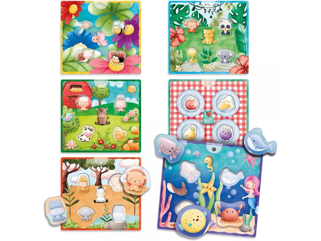 A táblák változatos jeleneteket mutatnak be: tanyasi állatok, tengeri világ, trópusi dzsungel vagy gyümölcsös így a gyerekek a világ sokféleségéről is képet kaphatnak. A puha anyag biztonságos, kisgyermekek kezébe is ideális, a vastag darabok pedig könnyen megfoghatók és illeszthetők. A játéktáblák akasztólyukkal is el vannak látva, így a falra is felakaszthatók, díszként vagy játékra készen.