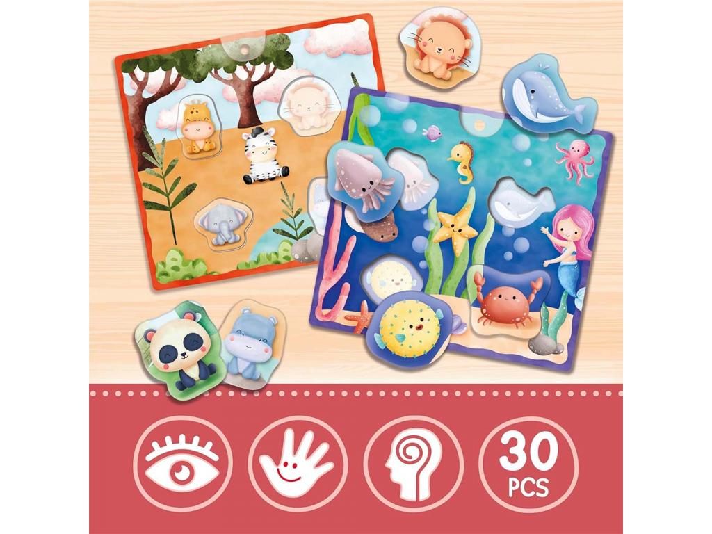 A puha, formaillesztő játékszett tökéletes választás, ha szeretnéd, hogy gyermeked játékosan fedezze fel az állatokat, formákat és színeket. A készlet 30 darab puha tapintású elemből áll, amelyek különböző, bájos tematikus táblákhoz kapcsolhatók. A gyerekeknek az a feladatuk, hogy a megfelelő állatfigurát a hozzá tartozó kivágott formába illesszék így fejlődik a kézügyességük, formafelismerésük és koncentrációjuk. A Montessori elvek alapján készült szett ösztönzi a megfigyelőképességet, miközben élvezetes játéklehetőségeket kínál akár egyedül, akár közösen játszva.