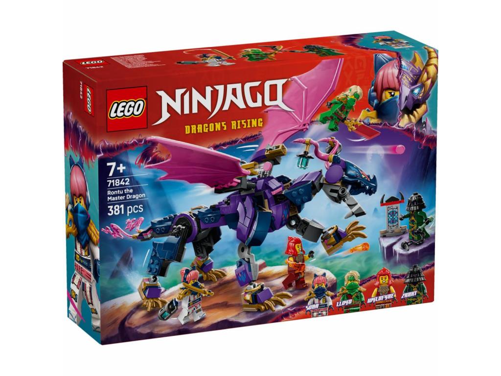 A LEGO NINJAGO Rontu, a sárkánymester (71842) játékkal a 7 éves vagy nagyobb nindzsarajongók eljátszhatják a NINJAGO Sárkányok birodalma 3. évadának akciókkal teli jeleneteit. Ez a gyerekeknek szóló játékkészlet tartalmaz egy játék sárkányt, amelynek beállítható farka, lába, szárnya, feje és állkapcsa van, a hátán 2 hely van a minifigurák számára, szárnyai alatt pedig egy-egy korongvető található.