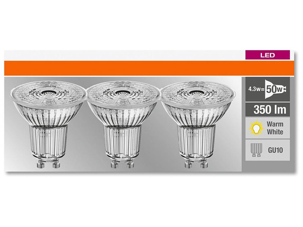 Az OSRAM Base 230V LED PAR16 spot, plasztik ház, 4,3W 350lm 2700K GU10 - 3 db-os szett leírása: