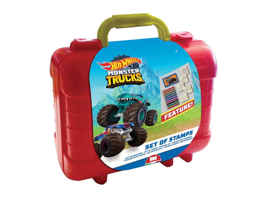Hot Wheels műanyag bőrönd 5 Hot Wheels bélyegzővel, egy bélyegzőpárnával, 10 színes ceruzával és matricákkal. Méretek: 23 x 20 x 12 centiméter. 3 éves kortól alkalmas.