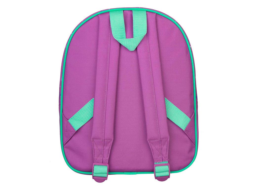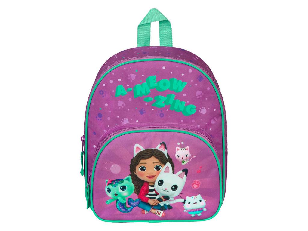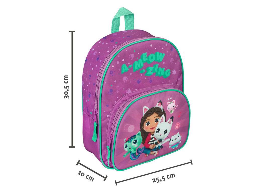Gabby's Dollhouse hátizsák extra nagy elülső zsebbel. A hátizsák lila és aqua zöld színű, mérete 30,5 x 25,5 x 10 centiméter. A vállpántok párnázottak és állíthatóak.
