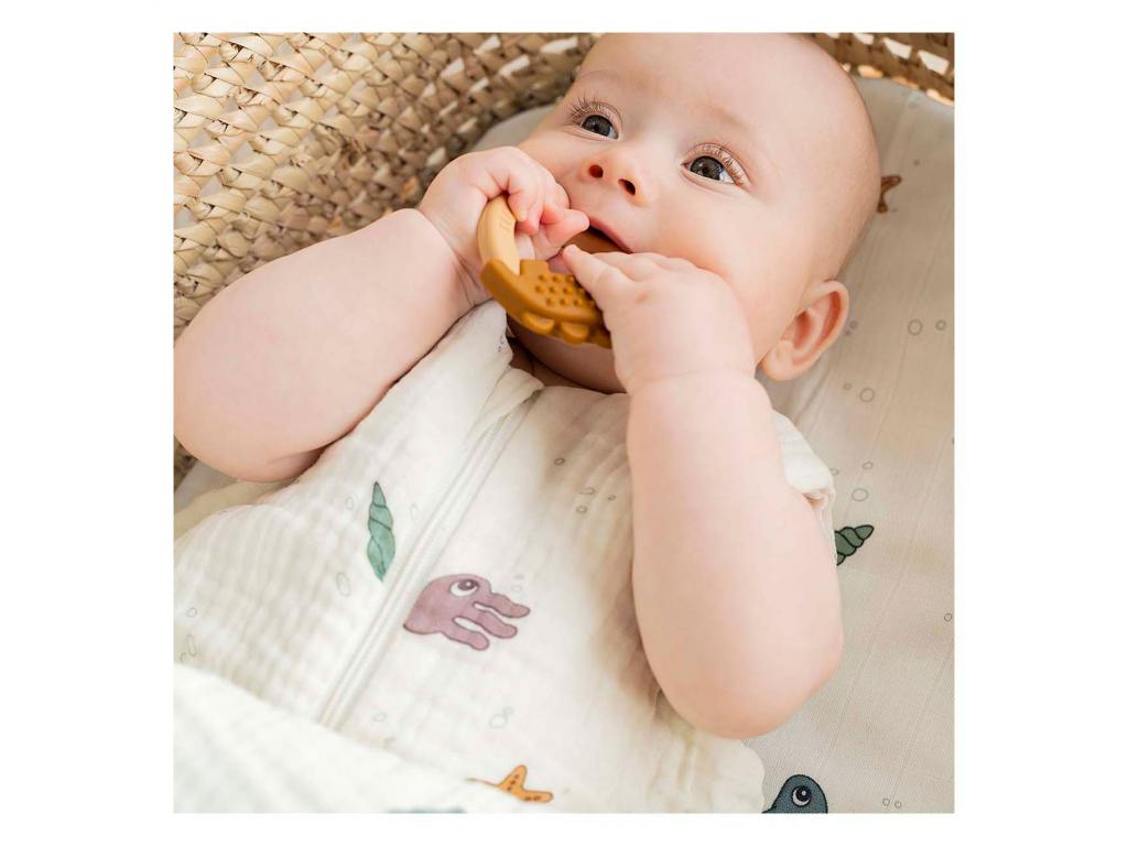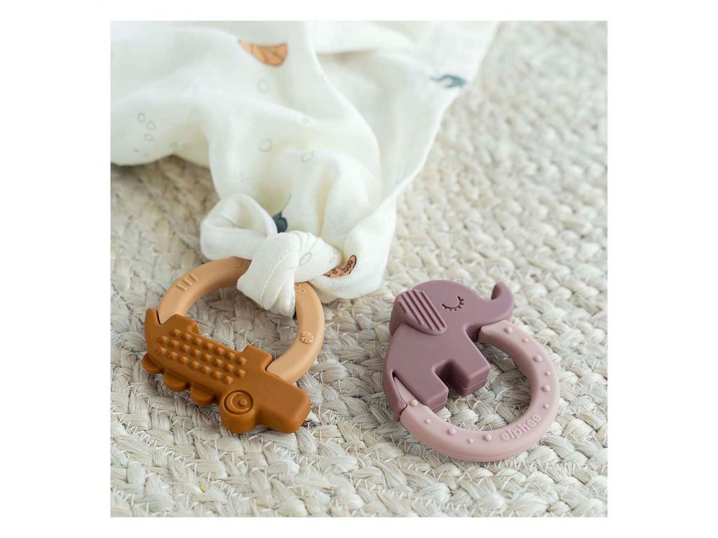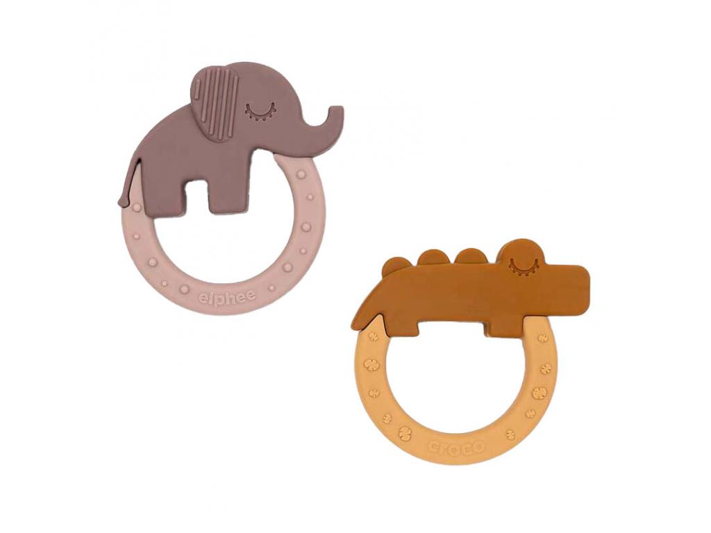 Két puha szilikon rágókarika szett, Croco és Elphee barátok formájában. A rágókarikák kis kezek számára is könnyen foghatók, és a különböző formák és textúrák segítenek stimulálni és megnyugtatni a fájó ínyeket. Hűtsük le őket a hűtőszekrényben, hogy további enyhülést nyújtsanak. A rágókák úgy lettek kialakítva, hogy még a legkisebb kezekbe is beleférjenek, és stimulálják a baba vizuális, orális és tapintási érzékeit. A lágy púder- és mustárszínek, a vidám textúrák, az imádnivaló elefánt és az aranyos krokodil teszik ezt a szettet tökéletes első játékká. Jellemzők 3 hónapos kortól alkalmas Hőmérsékletálló: -40 °C és 230 °C között Elphee: 7,6 x 8,3 x 2 cm Croco: 8 x 7,6 x 1,5 cm Mosogatógépben mosható 100 °C-on