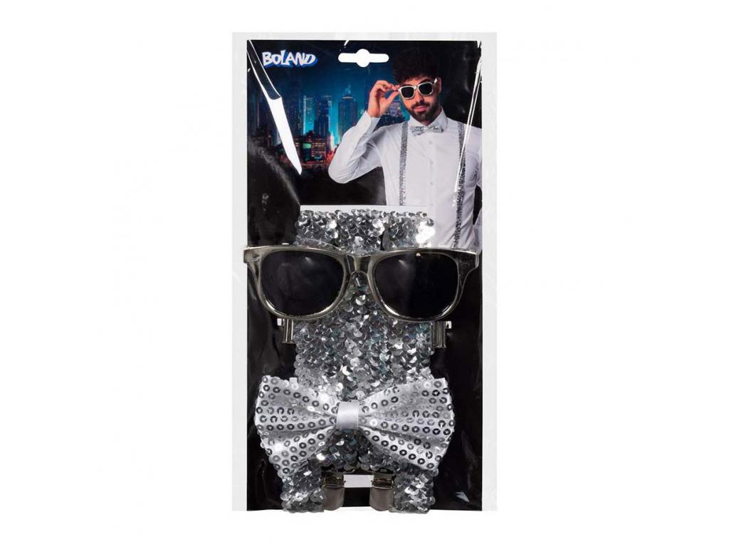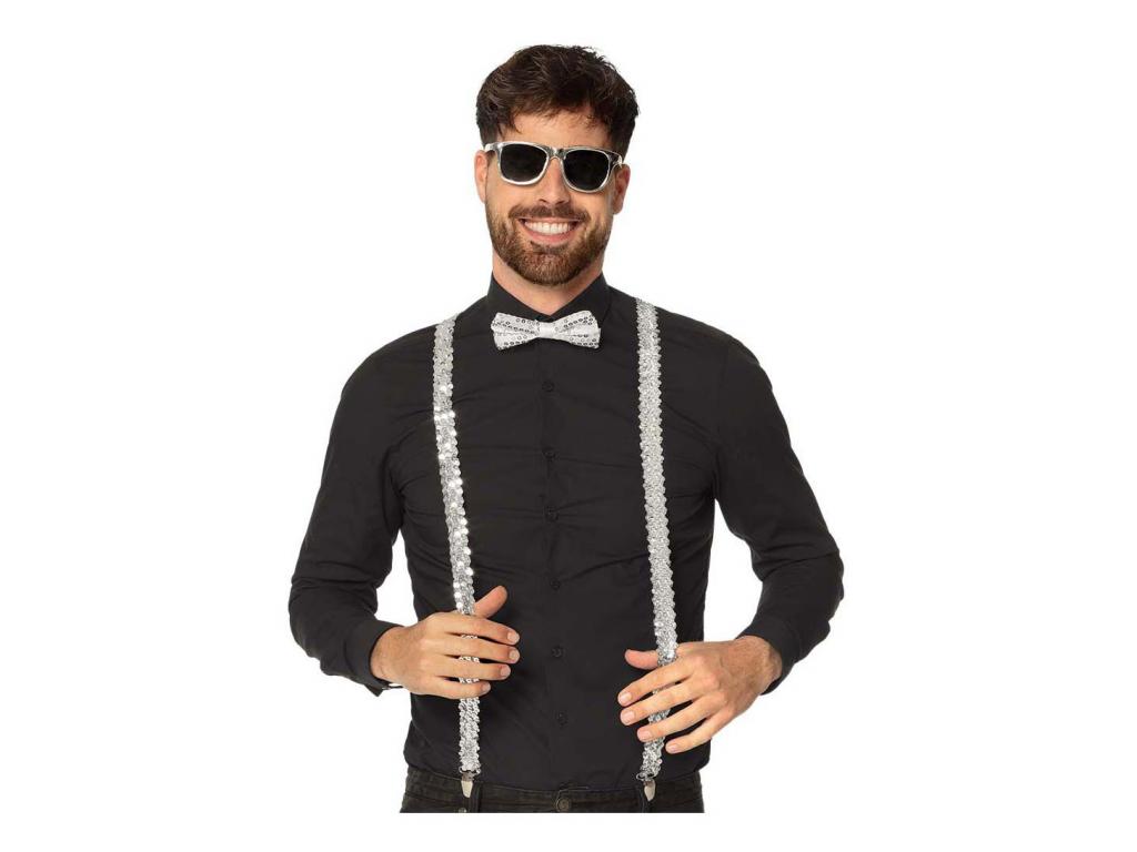 Ezüst kiegészítő szett, amely party szemüvegből, csokornyakkendőből és nadrágtartóból áll. Különböző anyagokból készült. 14 éves kortól alkalmas.