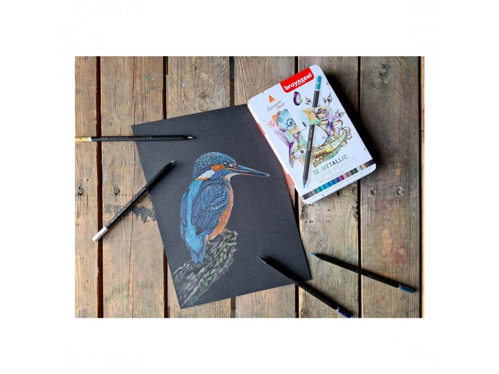 12 darab kiváló minőségű színes ceruza fényes metál színekben. A ceruzák vastag, 3,3 mm-es grafitmaggal rendelkeznek, amely kiváló minőségű pigmenteket tartalmaz az extra jó színtartás érdekében. Gyönyörűen mutatnak fekete és fehér papíron.