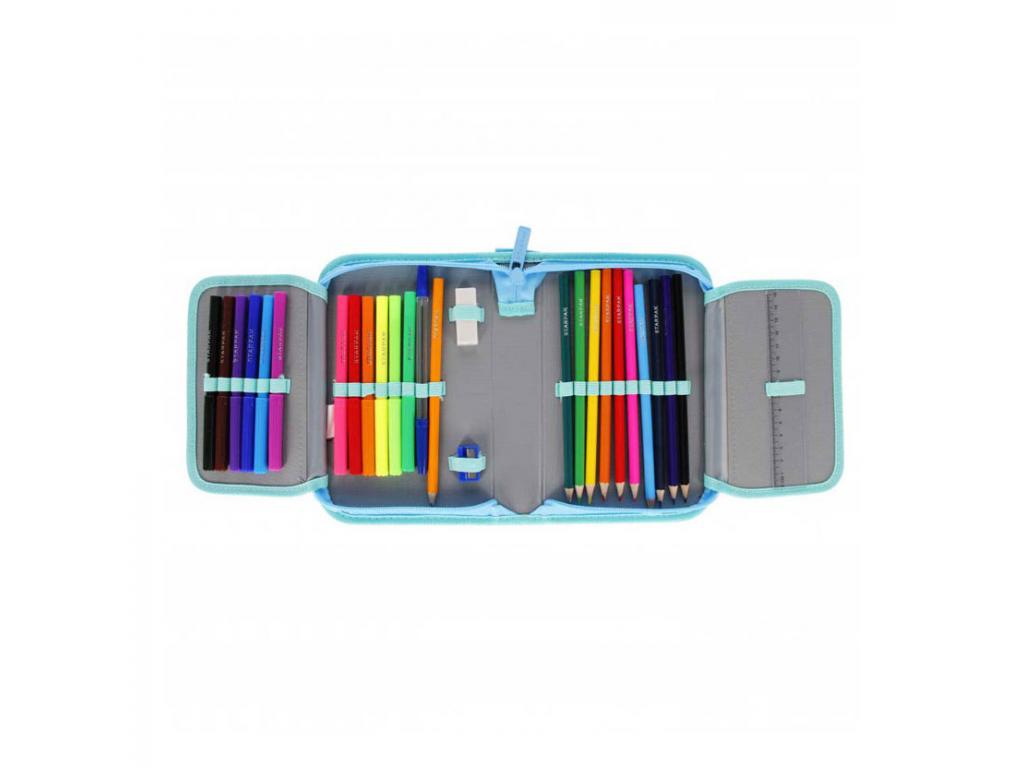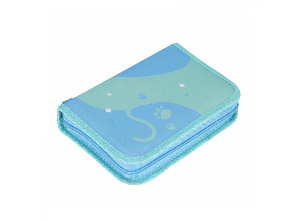 Töltött tolltartó kék színben, cicával. A tolltartó közel 30 darabot tartalmaz, köztük ceruzákat, filctollakat és egyéb íróeszközöket. 3 éves kortól alkalmas.