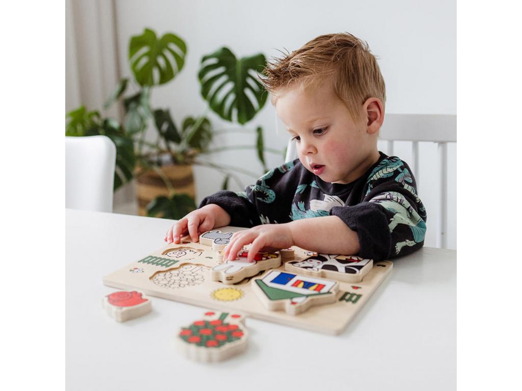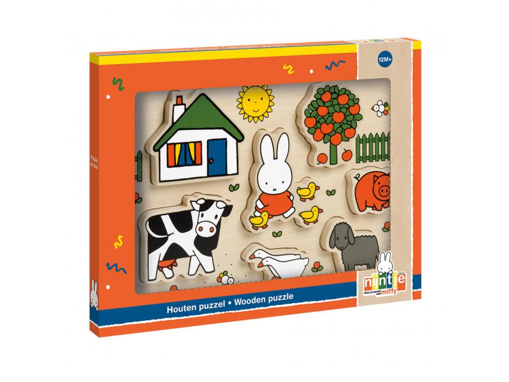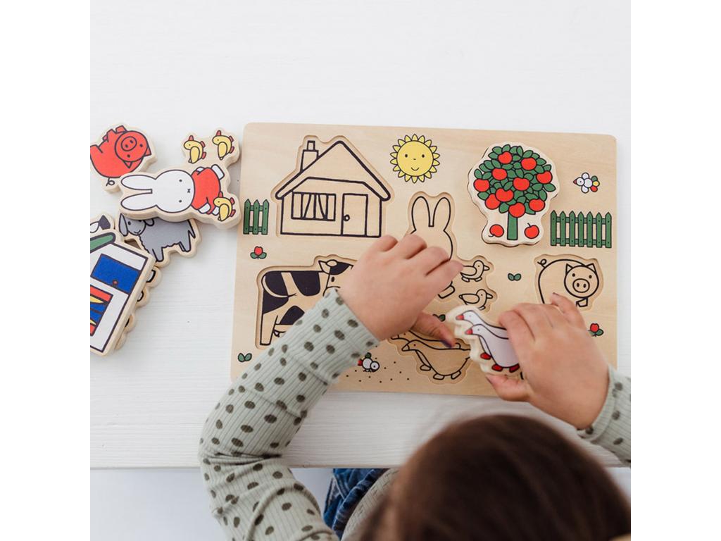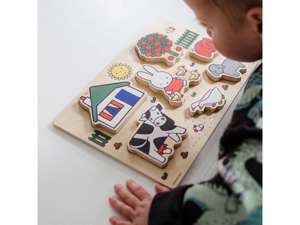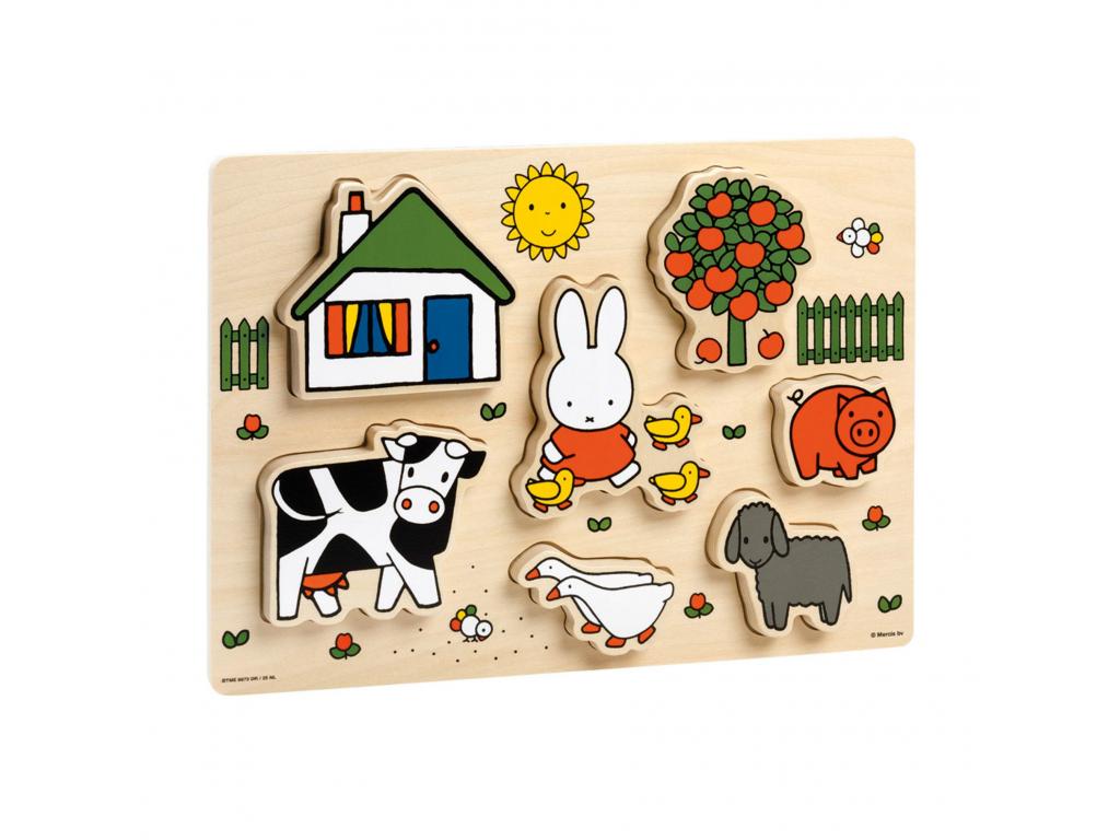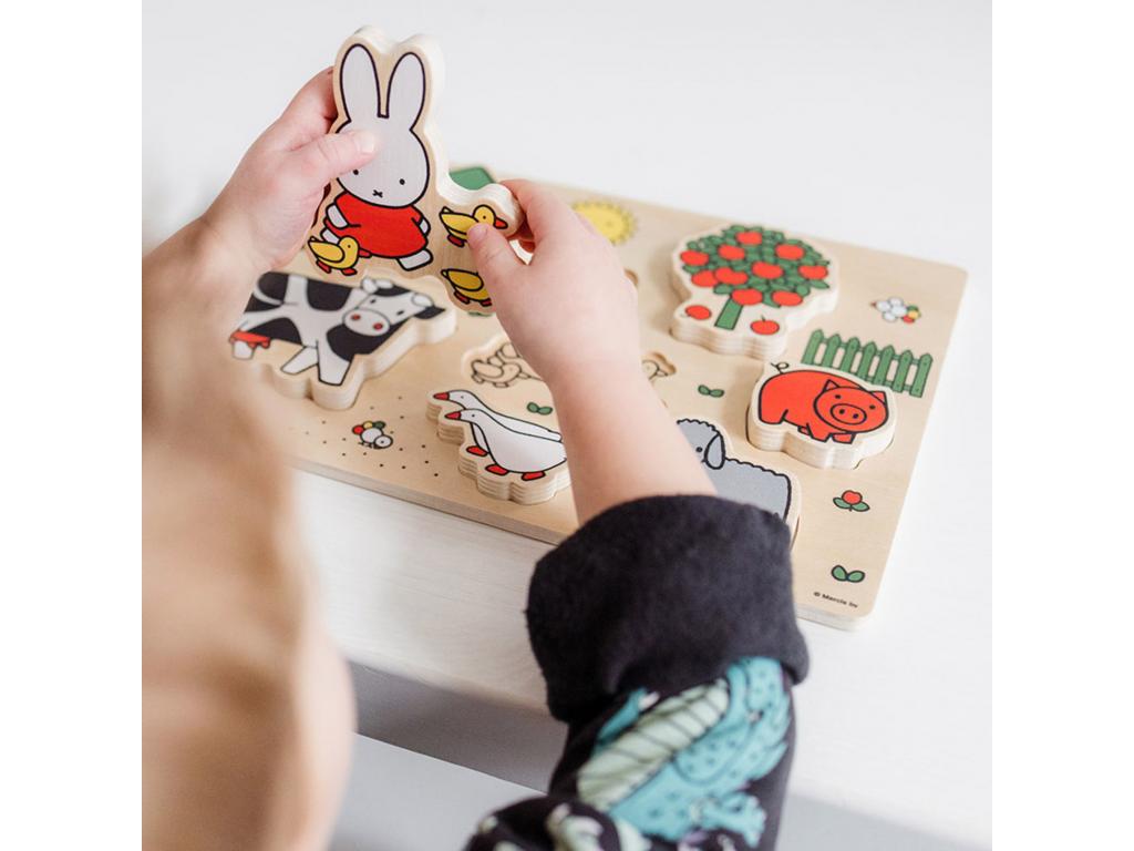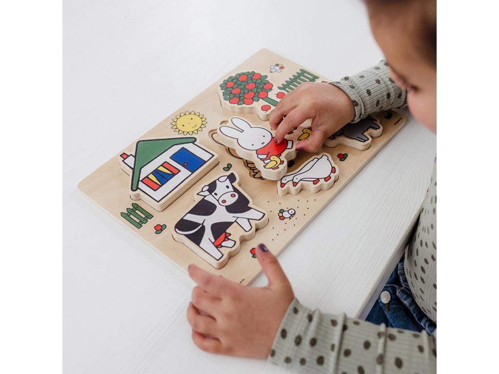 Miffy fa formapuzzle 7 fa betétfigurával, felismerhető Miffy illusztrációkkal. Méretek: 25 x 34 centiméter. 12 hónapos kortól alkalmas.