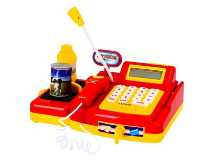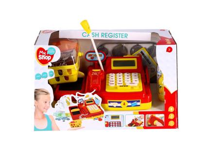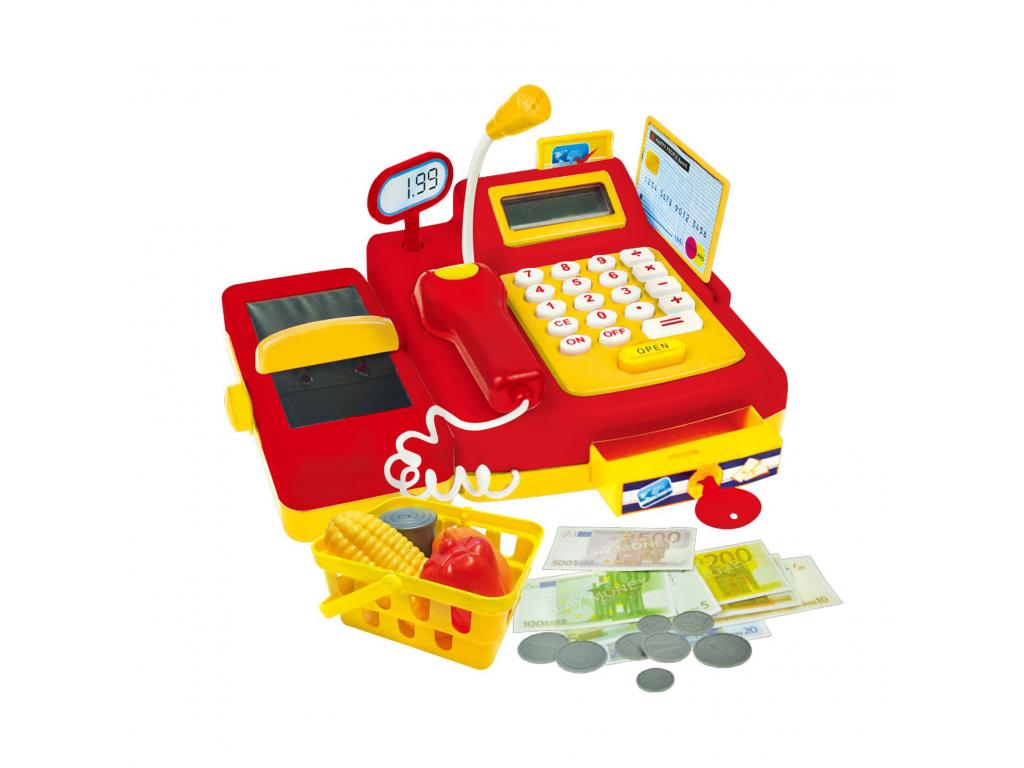 Szép pénztárgép kiegészítőkkel, például bevásárlókosárral és különböző árucikkekkel. Elemek: 2x AA elem mellékelve.