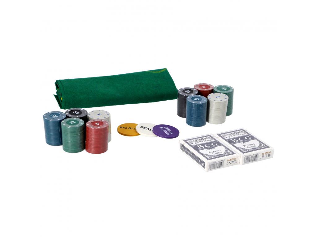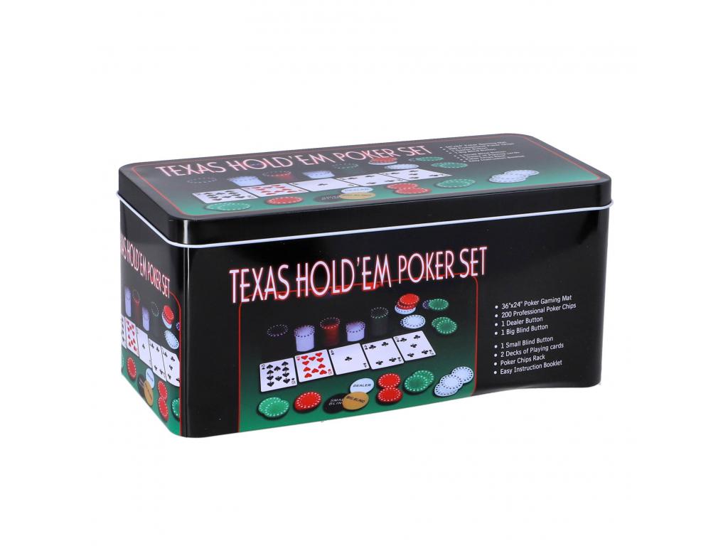200 darabos pókerkészlet praktikus tárolódobozban. A készlet tartalmaz egy játéktáblát, 200 darab professzionális pókerzsetont, 1 dealer zsetont, 1 big blind zsetont, 1 small blind zsetont, 2 pakli kártyát, egy pókerzseton-tartót és egy használati utasítást. 8 éves kortól alkalmas.