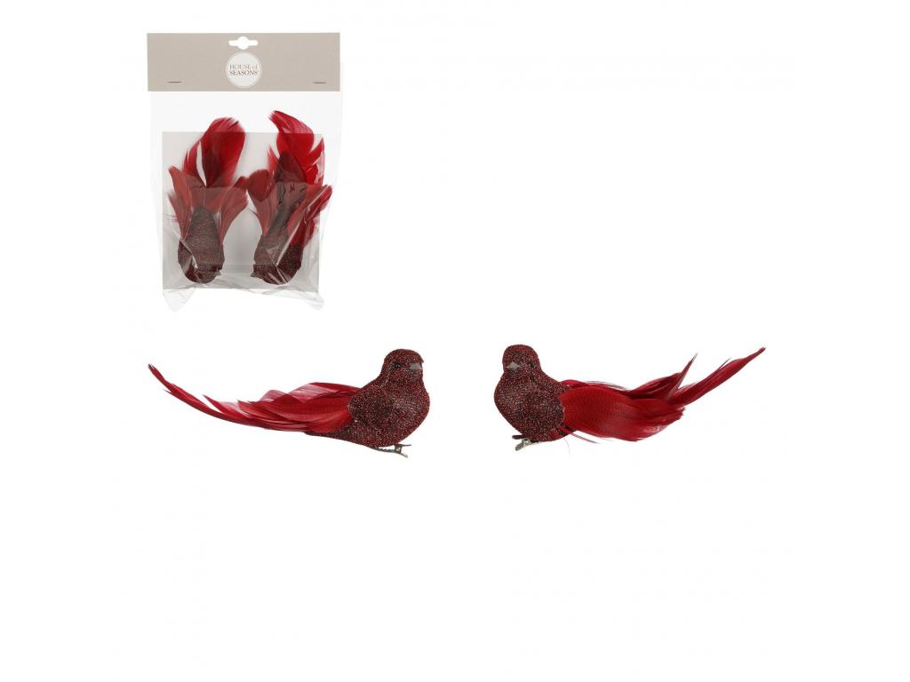 2 db dekoratív madár klipszen rögzítve az ünnepekre.