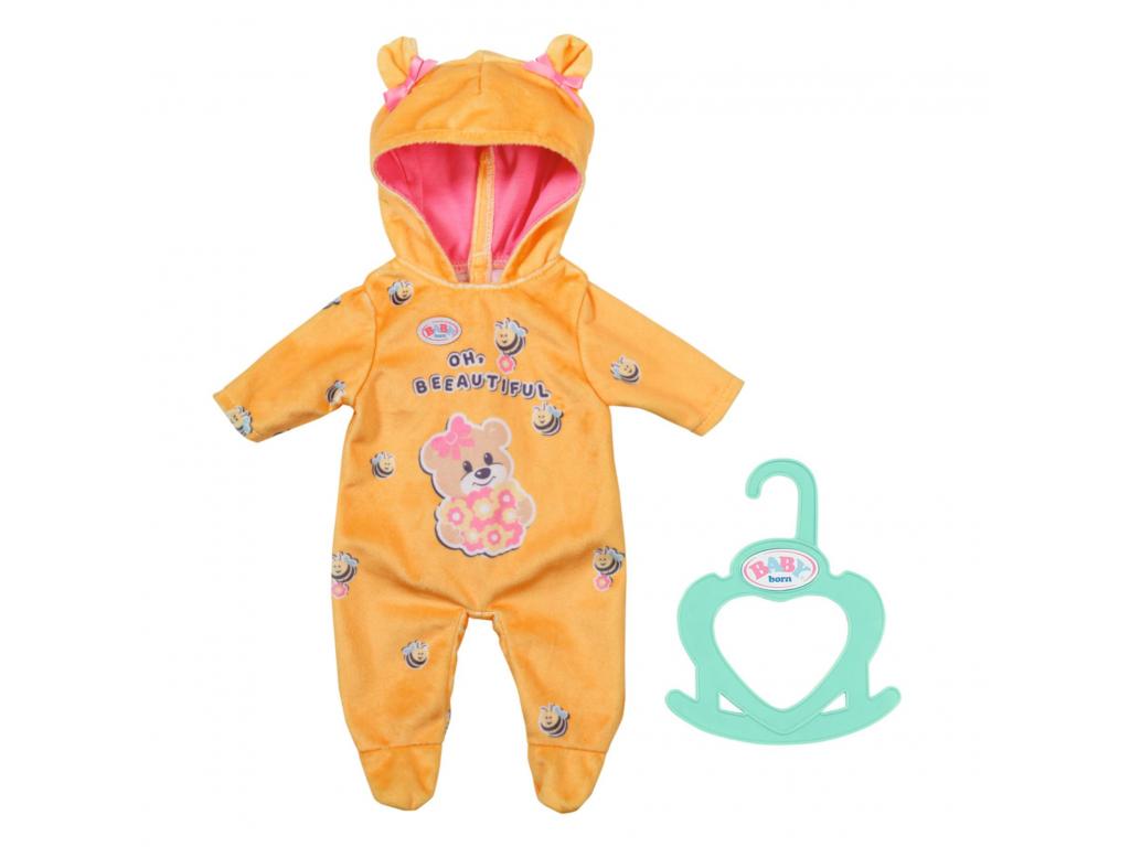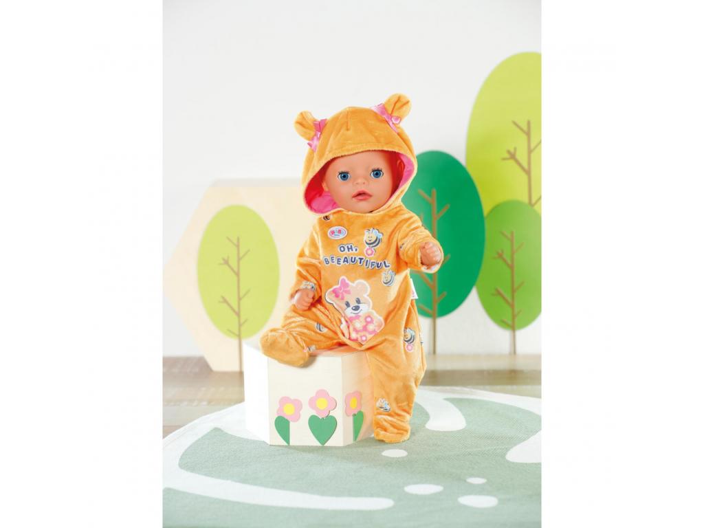 Mi ez a félelmetes morgás a játszószobából? Baby Born baba felvette a mézszínű kezeslábasát, és úgy tesz, mintha egy nagy medve lenne. De a kapucni kedves füleivel inkább egy aranyos medvebocsra hasonlít. A füleket rózsaszín masnik díszítik. A játékruha úgy van kialakítva, hogy még a legkisebb kezek is könnyedén fel- és levehetik. A plüss anyagán Mrs. Bear virágos ételt szolgál fel a méheknek.