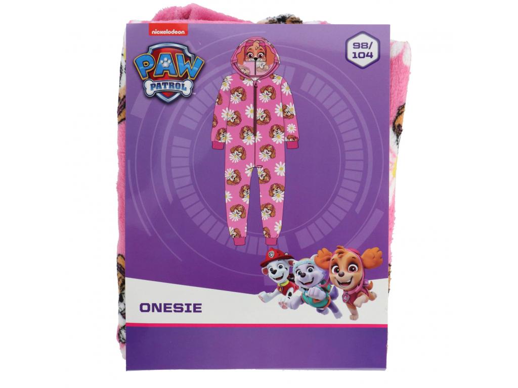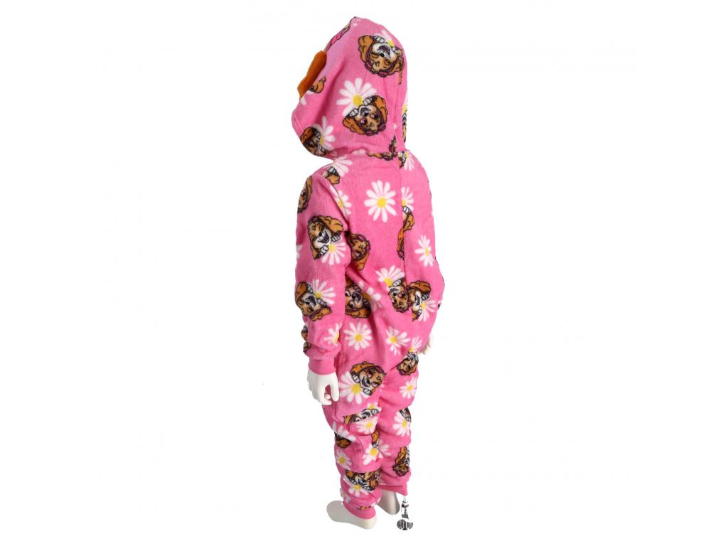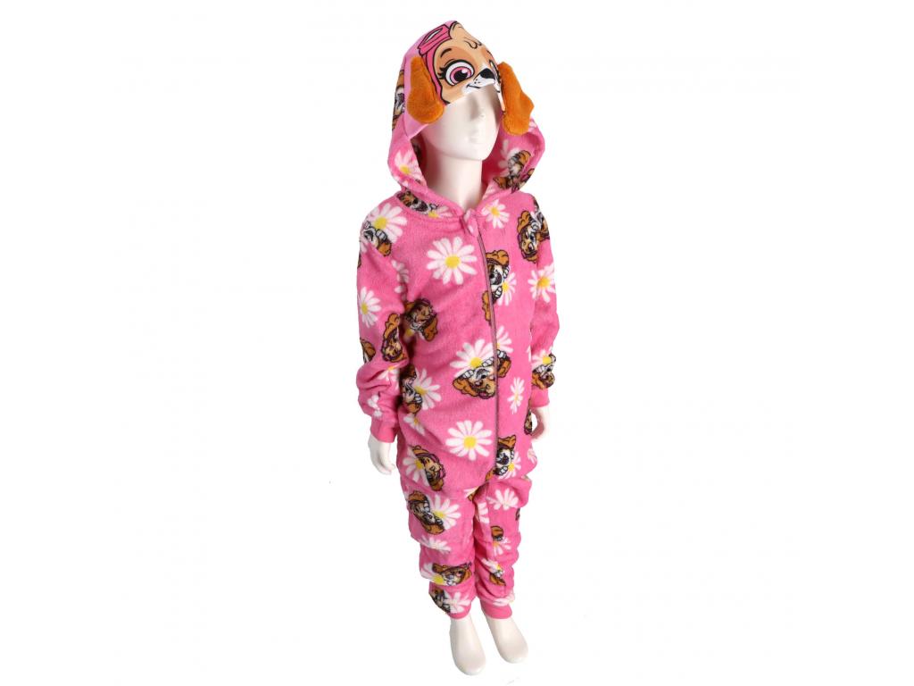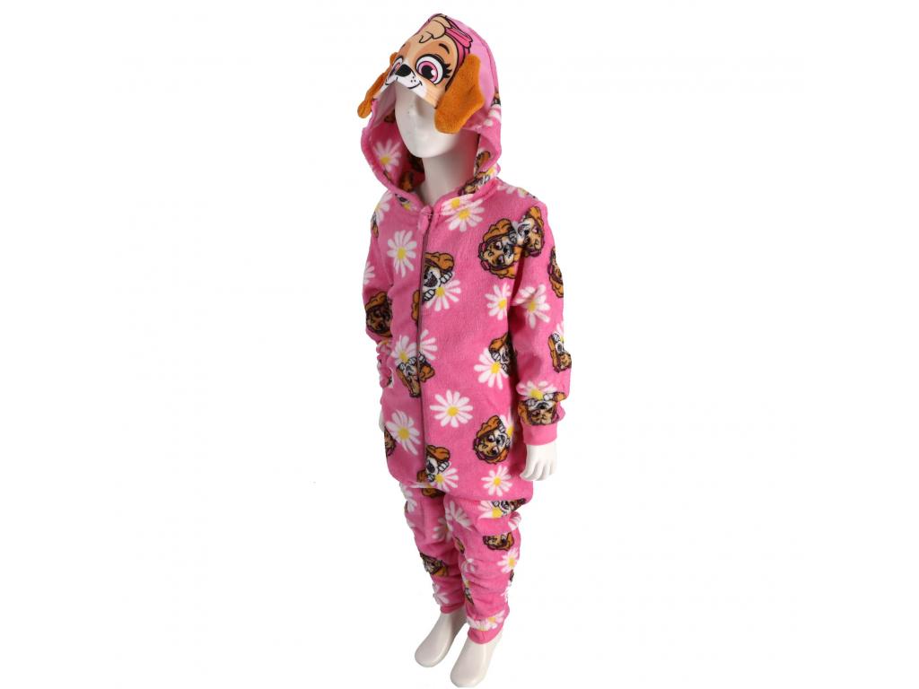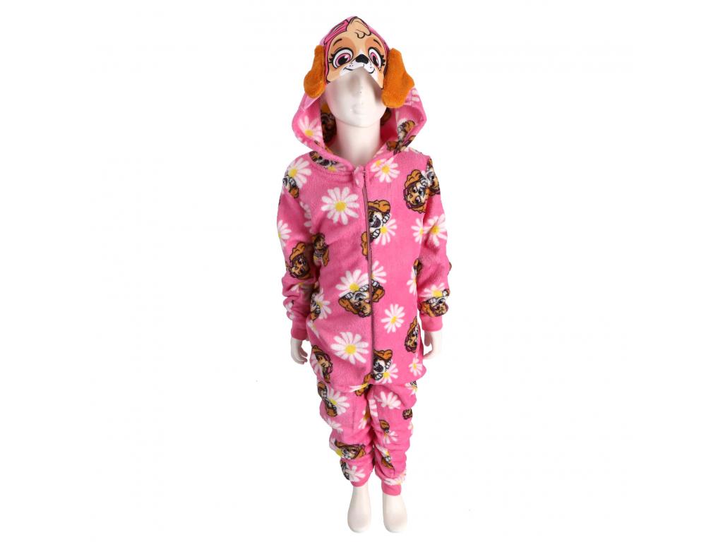 Rózsaszín Mancs Őrjárat pizsama 98-104 méretben, Skye, a Mancs Őrjárat híres kiskutyájának képeivel. Kapucni Skye pofájával és füleivel. 100% poliészter, 30 fokon mosható.