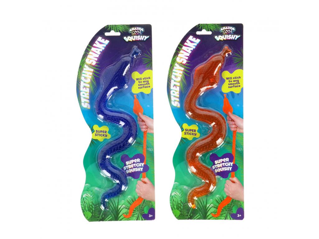 Nyújtható kígyó, kb. 40 cm méretű. A kígyó megnyújtható, összenyomható és deformálható, de mindig visszanyeri normál alakját. Ez a ragadós kígyó minden sima felületen megmarad. Különböző színekben kapható, véletlenszerűen. 3 éves kortól alkalmas. Többféle változatban kapható, szállítás véletlenszerűen. Az ár 1 db termékre vonatkozik.