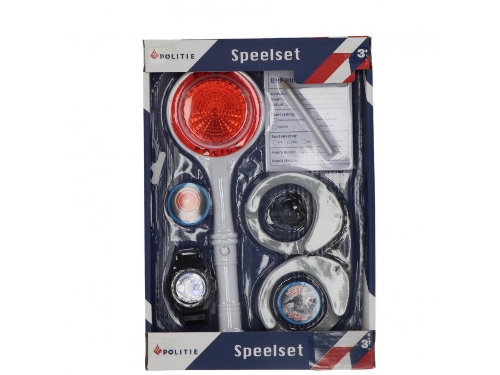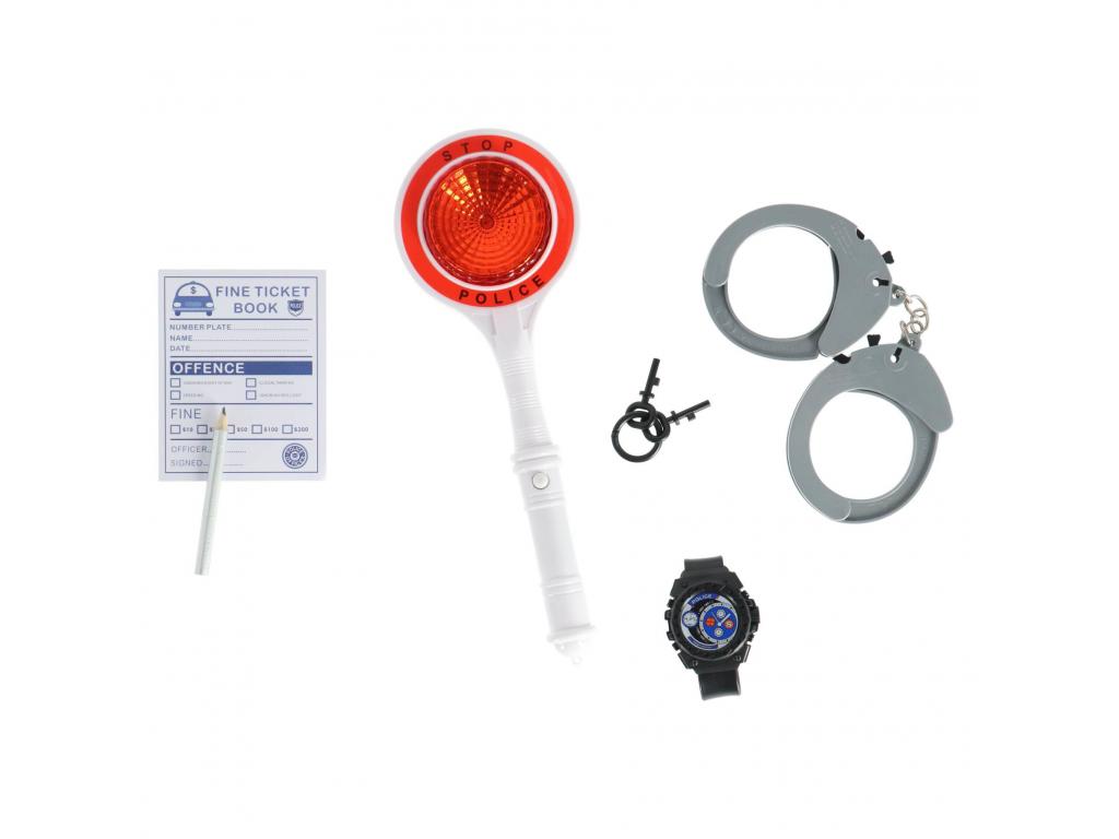 Rendőrségi szabályok játékszett világítással. Szép rendőrségi játékszett. Tartalom: bilincsek kulcsokkal, jegyzetfüzet büntetőcédulával, stop jelzés világítással, rendőrségi óra. 3 éves kortól alkalmas.