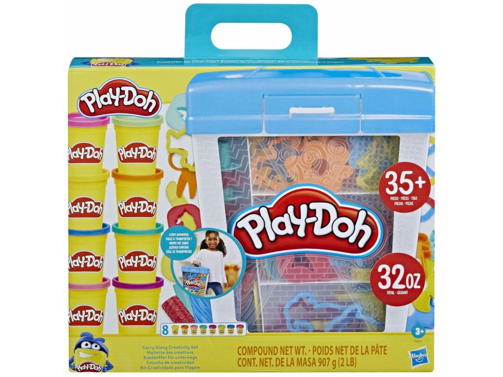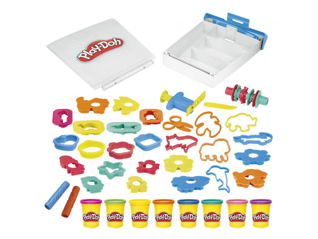 Playdoh gyurmaszett 8 féle gyurmával és sokféle formával, könnyen hordozható bőröndben. Súlya: 907 gramm.