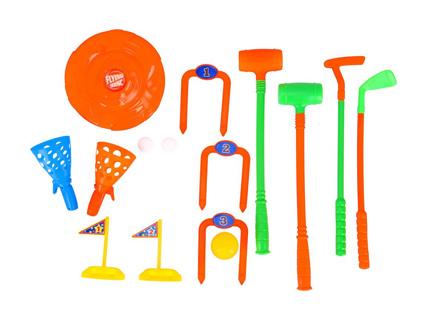 Tartalom: Frizbi, Dobós-elkapós játék, Gyűrűdobás, Bowling, Mini Golf, Krokett.