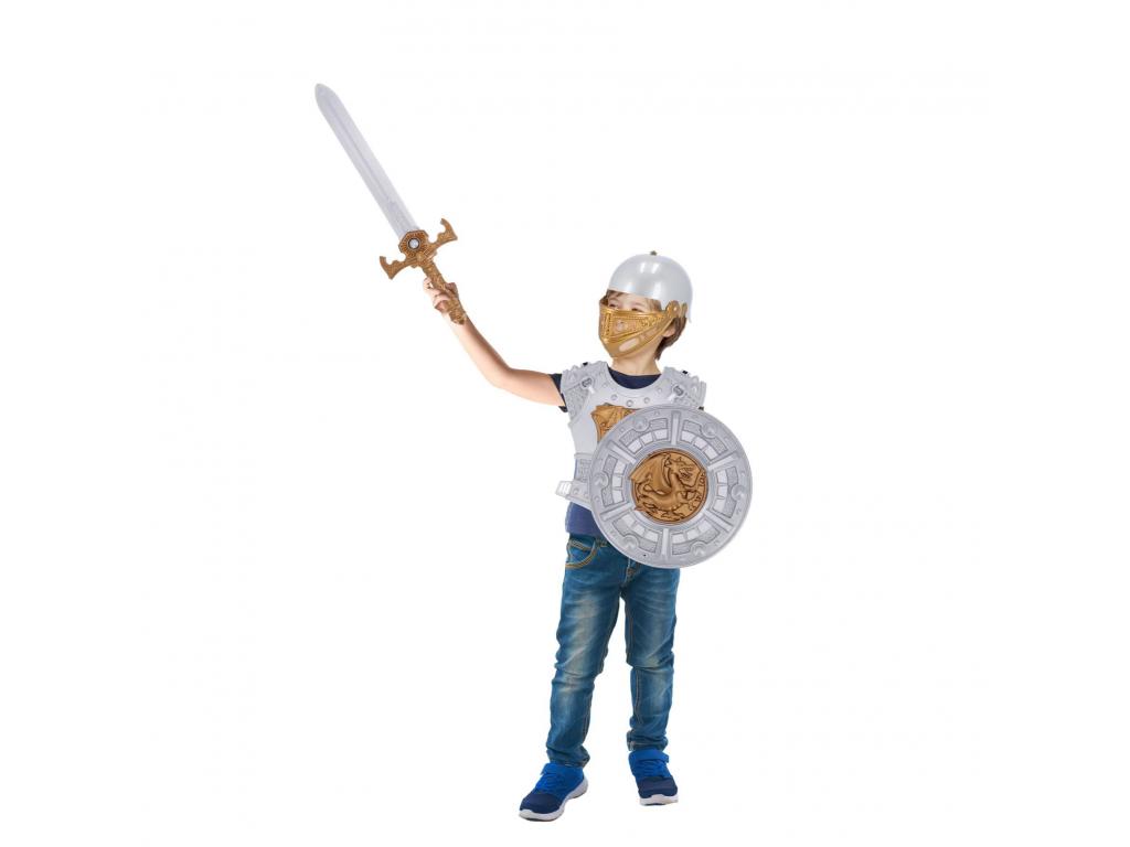 4 részes műanyag lovagkészlet, amely sisakból, mellvértből, kardból és pajzsból áll. Vívj csatát a veszélyes sárkánnyal, és mentsd meg a hercegnőt (vagy herceget!). 5 éves kortól alkalmas. Ideális jelmezkiegészítőként is.