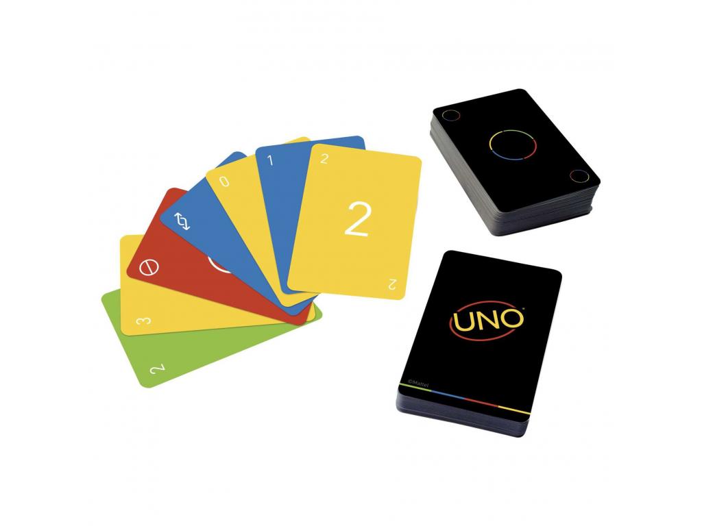 Letisztult, minimalista felületű Mattel UNO kártyaszett, szabályai és játékmódjai megegyeznek a hagyományos UNO-paklik játékszabályaival.