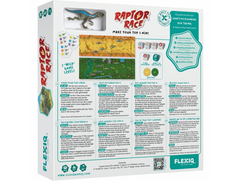 A Raptor Race társasjáték egy dobókocka alapú, szórakoztató taktikai táblás társasjáték, 2-5 személynek. 6 éves kor felett ajánlott. Egy játék kör kb. 20 perces. A játék nyelve: angol, német, holland, francia, olasz, spanyol.